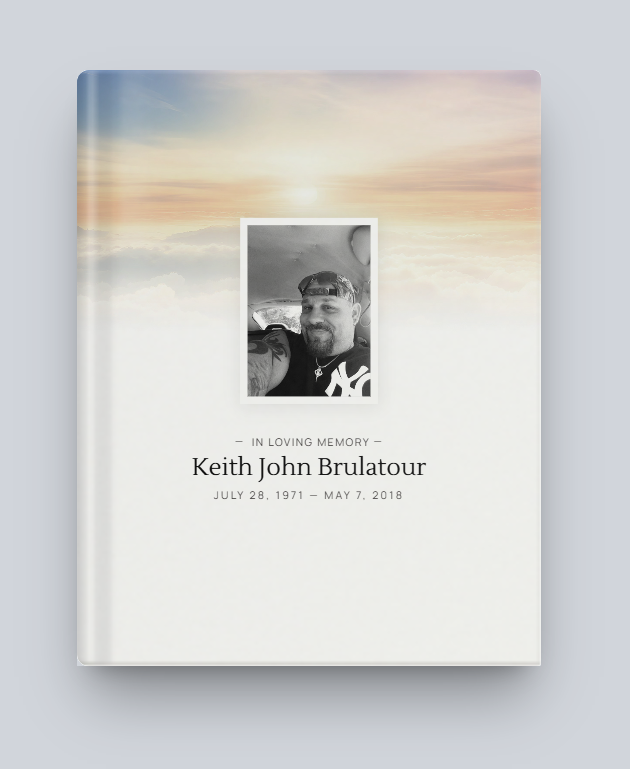 Keith John Brulatour, 46 of Warwick, NY unexpectedly passed away, Monday, May 7, 2018 at home. Keith was born in Ridgewood, NJ on July 28,1971 to Bruce and Mary (Cirello) Brulatour. He was married to Jennifer (Marsilio) Brulatour. Keith was a self-employed painter. Keith had an enormous heart of gold and a deep, profound love for his family and those he considered family. He was so proud of his children and cherished his time spent with each of them. Keith loved being a grandfather and treasured being Pop-Pop to Dominick. He was anxiously awaiting the birth of his second grandson. His kind, caring heart and his wonderful sense of humor will be missed by his loved ones. Keith was a huge animal lover and was devoted to his beloved dog, Lilly. Keith is survived by his wife Jennifer; sons, Mathew Brulatour, Justin Brulatour and fiance Aimee Stormann of Dundalk, MD, Andrew Brulatour and fiance Bree Manion of New Windsor , NY; daughter, Alexis Brulatour and fiance Kyle Meissner of Newburgh, NY; parents, Bruce and Mary Brulatour; Brothers, Bruce, Jr and Christopher of Warwick, NY; maternal grandmother, Mildred Ciffo of Wayne, NJ; grandson, Dominick Brulatour, expected grandson, Andrew Keith; niece, Nicole Brulatour; great-niece, Catalina; great nephew, Christian; several nieces and nephews. The family asks to help support the unexpected expenses via Go Fund Me at https://www.gofundme.com/funeral-expense-for-keith-brulatour?. A Memorial Visitation will be held on Friday, May 11, 2018 during the hours of 4:00 to 6:00 PM at Flynn Funeral & Cremation Memorial Centers, Inc., located at 139 Stage Road, Monroe, NY 10950 Cremation was at Oxford Hills Crematory, Inc., Chester, NY 10918. A Repast will follow (Gathering of Family and friends) at the family home in Warwick, NY at 7:00 PM. Funeral and Cremation Arrangements have been entrusted to Thomas F. Flynn and the staff of Flynn Funeral & Cremation Memorial Centers, Inc.